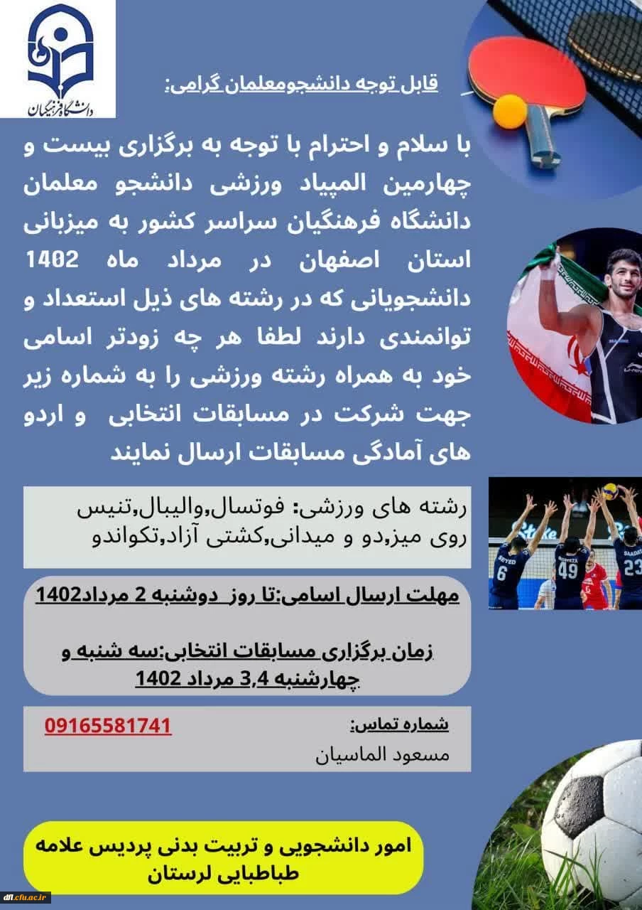 امتیاز دهید : فراخوان شرکت در بیست و چهارمین المپیاد ورزشی دانشجو معلمان دانشگاه فرهنگیان کشور 2 دوشنبه 2 مرداد 1402 ساعت 11:18